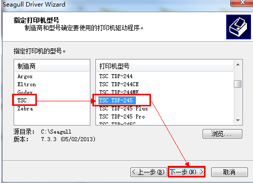 打印机型号选择TSC TDP-245,然后选择下一步。