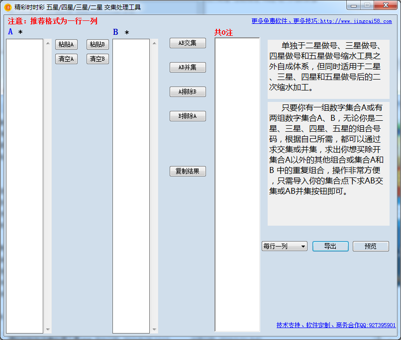 只要您有一组数字集合A,或有两组数字集合A、B,无论是二星、三星、四星还是五星的组合号码根据自己需求都可以通过求交集或并集,求出您想买除开集合A以为的其他组合或集合A和B中的重复组合,操作非常方便。并且声称的号码支持自定义格式的导出、预览和复制。