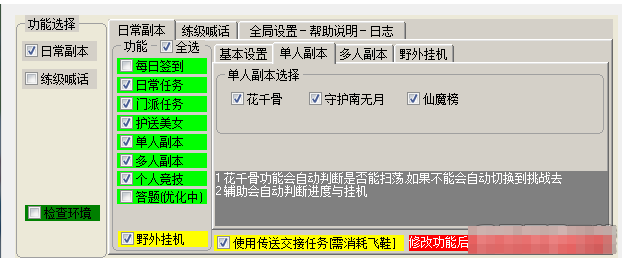 日常副本功能设置一:糖果花千骨辅助自动执行每日签到、日常任务、门派任务、护送美女、单人副本、多人副本、个人竞技等任务和活动。
