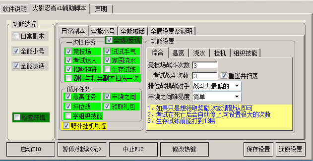 日常副本功能设置:糖果火影忍者ol辅助工具的日常任务可以进行竞技场、试试手气、考试达人、家园浇水、招财神符、生存试练和剧情与精英副本扫荡一次。循环任务可以进行悬赏任务、丰饶之间、排位战、领取礼包和学组织技能和野外挂机刷怪。