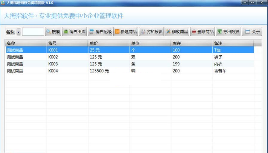 大拇指进销存管理软件精简版是一款永久免费的傻瓜型的进销存精简版。其功能强大、操作简便、界面美观、程序精小,是管理服装销售、箱包鞋帽、商品销售管理等行业的好帮手。支持按商品品名和货号查找搜索商品、支持商品报表统计打印、支持查看每日销售记录和统计、支持商品数据资料Excel表格文件导出等。