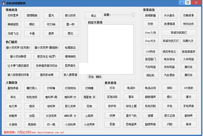 DXLW语音背景音效软件不仅本身小巧玲珑,而且操作简单,支持搞笑音效、人物音效、背景音效等等、还可以自定义音效。包括的音效有:欢呼掌声、微博刷新、群众的笑、喝彩、吹口哨、鼓声、心跳声、火车鸣笛声等等,并且还可以任意调节音量大小和停止音效。