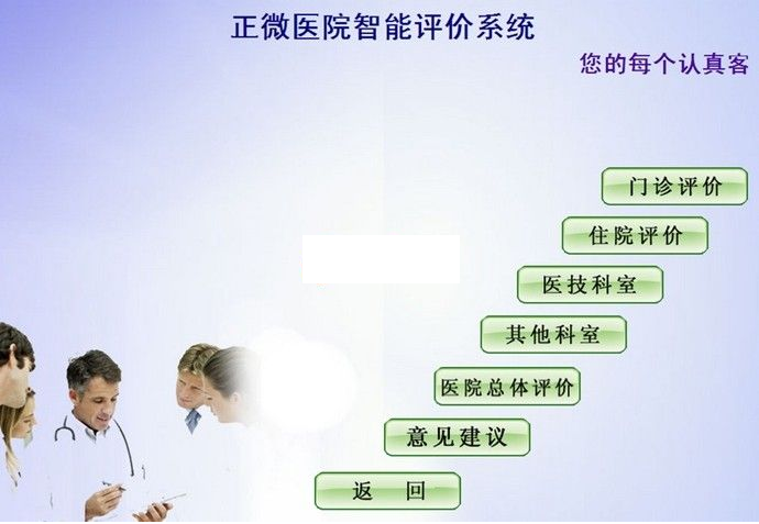 正微医院智能评价系统对于提升服务质量和效率,起着积极的推动作用。经济的飞速发展致使各行各业的竞争日益激烈,对于客户服务质量标准的要求也越来越高。如何提高单位的服务质量,提高服务人员的工作积极性是摆在单位领导面前的一迫切问题。为提高服务人员的服务质量,提升服务顾客满意度,开发出的正微评价系统。通过顾客对服务人员及单位的服务质量进行评价,方便管理者对服务人员的服务质量进行统计,可对评价记录进行量化考核,用评价分值统计对员工进行评比排序,监督到每个员工的工作质量,促进员工和企事业单位改进服务,提高客户满意度,同时也为客户创造更多更好的经济效益和社会效益!
