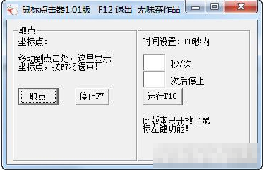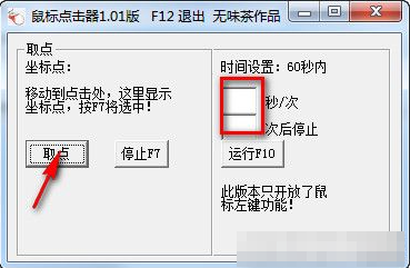 下载并运行软件,首先取点将移动鼠标到点击位置,这里显示坐标点,按F7将选中,F10键运行,F12键退出.