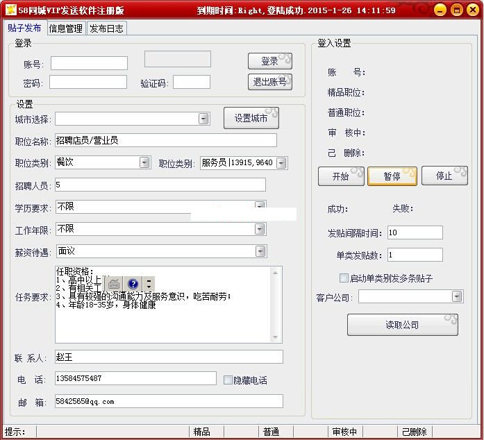58同城VIP发送软件是一款可以帮助用户发布58同城所有全职招聘,兼职招聘信息可选择城市进行发布可选择类目地行发布。非常实用,欢迎下载。
