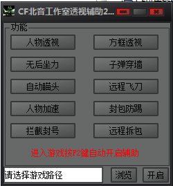 CF北音工作室透视辅助2016是一款可以在游戏中赋予你超强功能的游戏辅助。支持人物透视、方框透视、无后坐力等等功能。欢迎下载使用!
