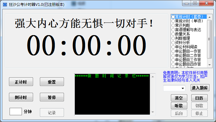你能想象拥有正倒计时,有暂停功能,记录功能,题库,听歌放松这些功能的软件是一款计时器吗?狂沙计时器就是拥有这些功能,强大的不行有木有。欢迎下载使用!