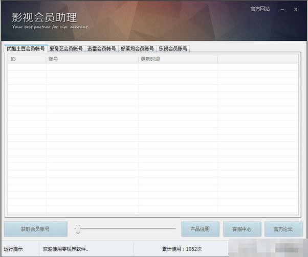 零视界会员帐号助手是一款功能强大、便捷实用的会员账号获取器,此款软件可以帮助用户快速获取优酷、爱奇艺、迅雷、腾讯、乐视等视频站的会员账号。软件操作简单、绿色免费,喜欢的话可以来下载使用。
