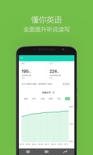 词汇听力都不错,还是不会说?“英语流利说”采用创新的口语教学理念,直接从真实场景的实用对话入手,带动词汇、语法、听力等其他能力的全面提升,帮助用户真正解决在各类实际对话场景中说什么话题,怎么说的问题。