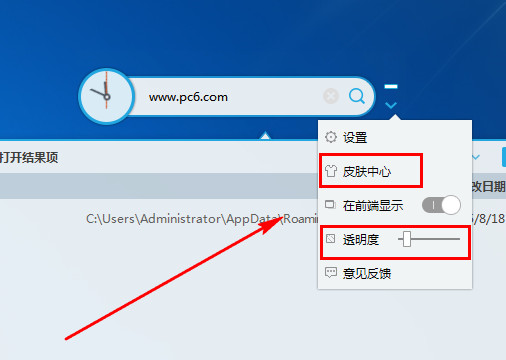 点击倒三角===点击皮肤中心就可以选择你自己喜欢的皮肤或者滑动透明度滑块。可以调节软件透明度
