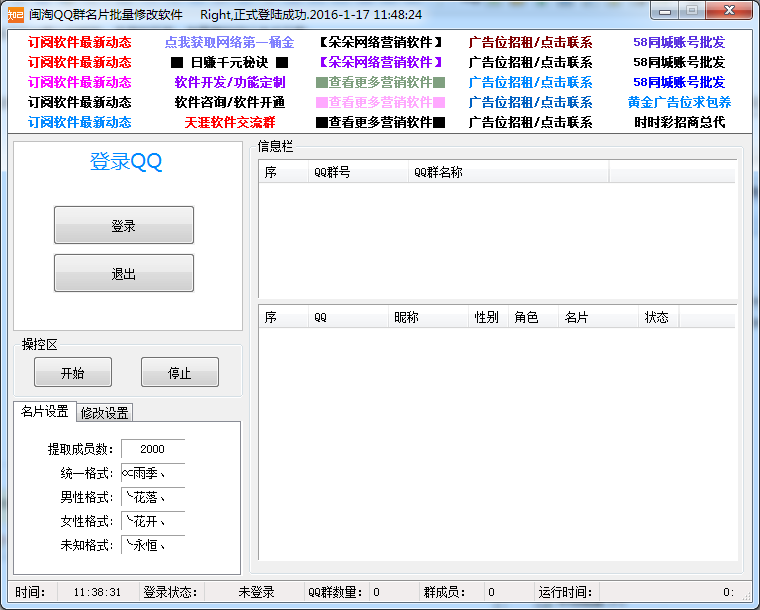 闽淘QQ群名片批量修改软件是一款最近非常流行的qq群名片修改器。该款软件界面小巧简洁、操作简单易懂,可修改用户所有QQ群的昵称。用户有了它就可以更加方便的管理自己在QQ群众的昵称了,非常实用方便,喜欢的朋友赶紧下载试试吧!