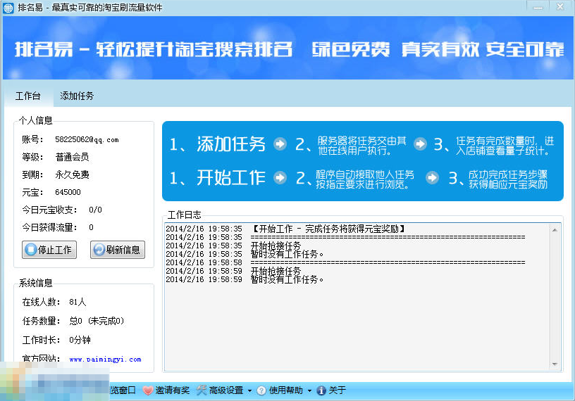 排名易免费淘宝刷流量软件是一款基于计算机网络对等互刷模式的流量互刷工具,即相互浏览对方的商品,真实优质搜索流量,全自动深度浏览。 由于保证了流量的真实性,无需担心降权,安全可靠,绿色免费,是中小卖家实现销量逆袭的好帮手。