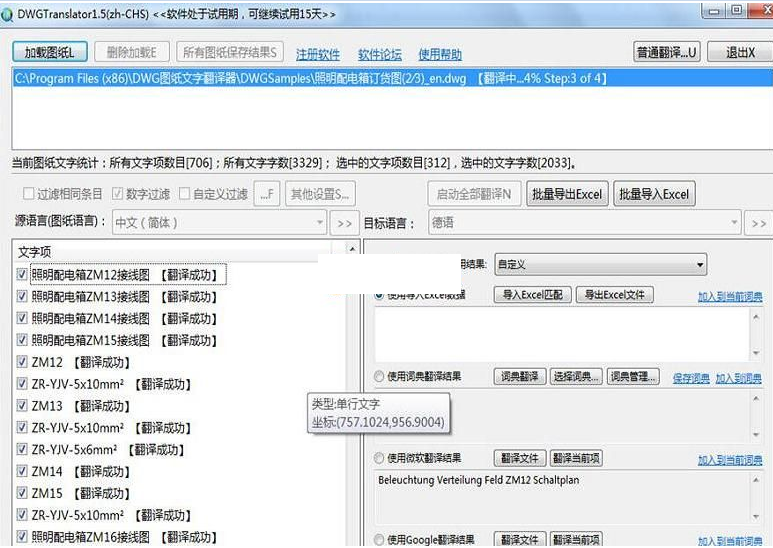 4.软件同时支持常规操作模式,可以在软件环境下装入图纸,查看每个导出的原文项,执行翻译,并写入操作。