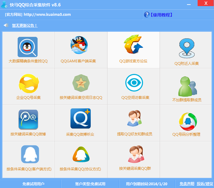 快马QQ综合采集软件采用网络账号形式,一个软件账号可以在不同电脑登陆,用户可以在家使用,也可以在公司使用,摆脱了传统软件采用机器码形式的弊端,真正意义上实现了以用户为中心,以服务为根本的营销理念。