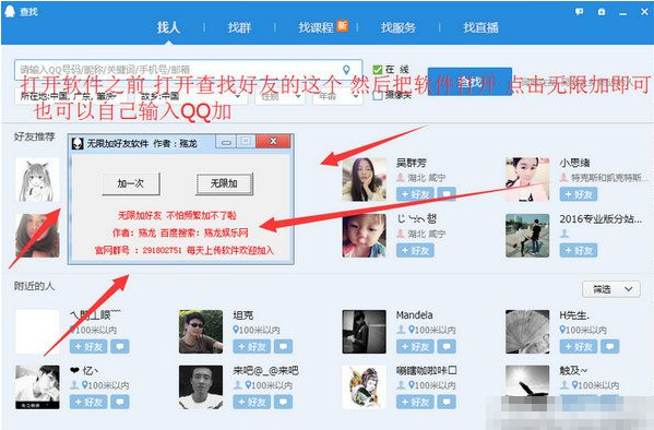 打开软件后,首先需要点击QQ面板的查找功能,然后按照个人需求选择某些地区以及性别等等,点击查找,完成一次之后就可以用软件无限加好友了,软件会自动获取句柄随机选择加人!