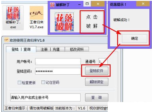 1、打开【王者归来V1.7.exe】和【破解补丁.exe】,点击破解;