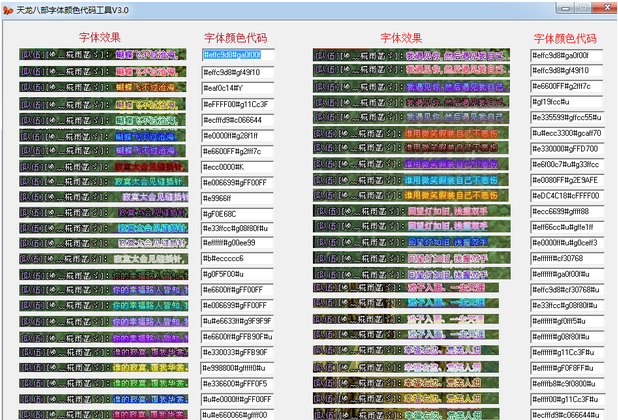 天龙八部字体颜色代码辅助工具可以让你在天龙八部游戏中打出最漂亮的字体。看中那个颜色点击一下就自动复制,然后粘贴在游戏中即可。 有需要的可以来此下载。