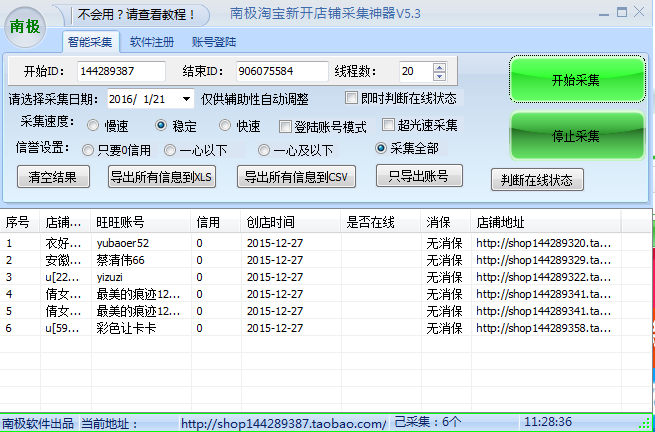 南极淘宝新开店铺提取神器可以按开店时间快速、方便的采集分析淘宝卖家,采集内容包括卖家账号,信用,店铺地址,消保状态等等数据。同时能过滤自己不想要的信用级别卖家.比如采集0信用的淘宝新开店铺。