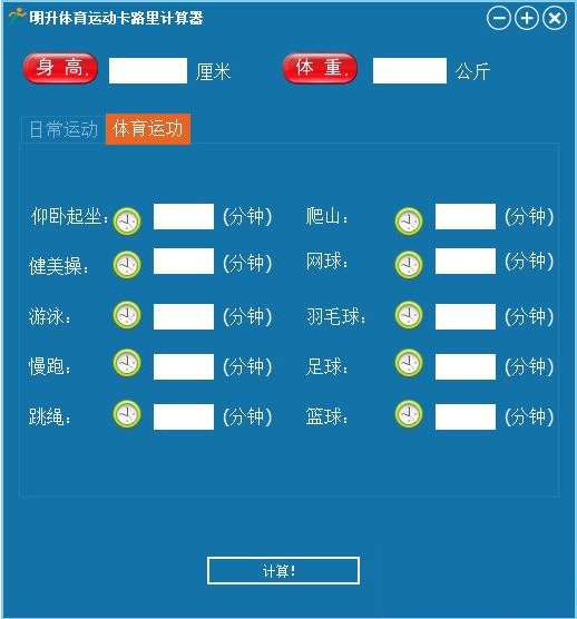 明升体育运动卡路里计算器是运动减肥的必备工具,明升体育软件提供了非常方便实用的运动热量计算工具,只要在计算器中填写您的体重和相应运动项目的时间,就可以准确算出今天活动消耗的卡路里,更便捷的是明升体育运动卡路里计算器提供了卡路里到脂肪的自动转换,可以直接看到你减去了多少重量的脂肪和体重,赶紧试试吧!