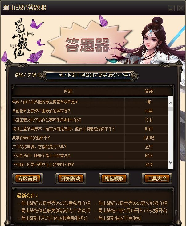 蜀山战纪答题器是一款可以帮助玩家快速答题,用户只要输入问题关键字,就可以快速获取答案。相当的实用。有需要的可以来此下载。