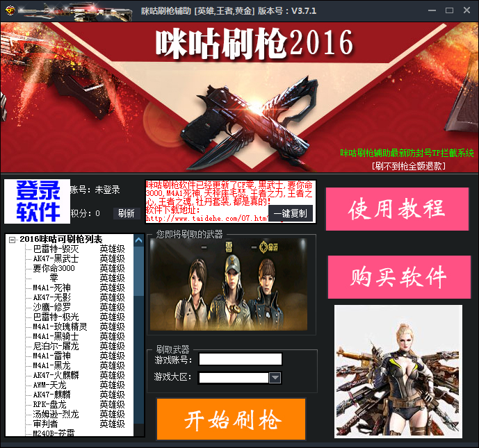 2016CF咪咕刷枪辅助是一款可以帮助玩家免费获得支持刷巴雷特极光、m4a1玫瑰精灵、awm天龙、m4a1死神等等武器的cf刷枪软件。有需要的可以来此下载。