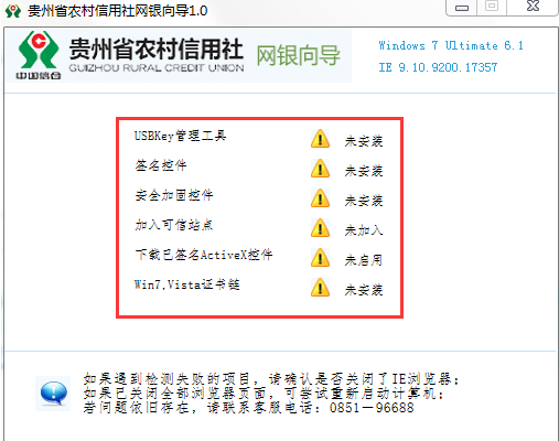 2、如果遇到检测失败的项目,请确认是否关闭了IE浏览器,如果已关闭全部浏览器页面,可尝试重新启动电脑,若问题依旧存在,请联系客服电话:0851-96688