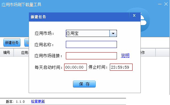 点击【新建任务】,在弹出的窗口中,选择你需要刷的应用市场,然后,填好对应的应用名称,以及相应的应用下载地址,再选择好每天的启动时间和停止时间,点击保存即可。