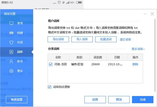 选择“词库”,点击上方的“备份词库”右边的“执行该操作”按钮。可以将当前字库备份到其他地方。