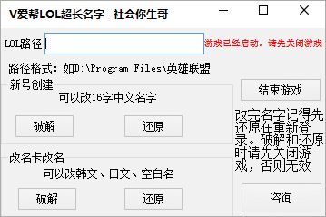 V爱帮LOL超长名字软件由作者社会你生哥制作,其提供了新号创建取超长16字中文名字,改名卡可改韩/日文及空白名字。