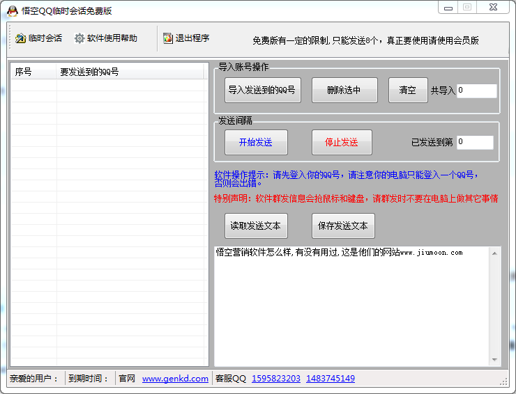 悟空QQ临时会话发送软件(QQ临时会话群发器)是一款给指定QQ发临时会话信息的群发软件,直接发起临时会话,无须加对方为好友,不用换QQ,一天可以几万条精准的广告信息,是QQ营销的最好助手,采用最新的协议!