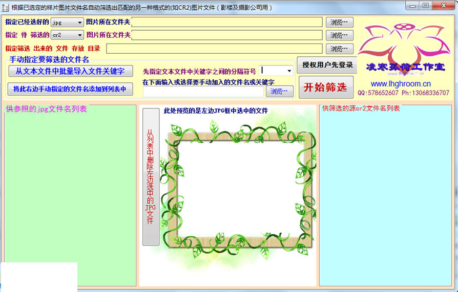 客户在影楼拍摄了一大批照片,这些照片用于印刷或冲洗的保存格式可能是CR2格式或其它特种格式的,而在印刷或制作最终作品前需要客户从拍摄的所有图片中选择一些客户自己认为满意的照片作最后的印刷和冲洗。给客户看的照片的格式一般是小样图片,格式一般是JPG之类的。当用户挑选出自己满意的样片之后,影楼才会根据客户挑选出的这些照片找到对应的特种格式高清照片进行印刷或冲洗。如果用户挑选的照片比较多,加上本身拍摄时的照片也多,这样查找起来就非常费时间,特别是当拍摄的照片被分为多个子文件夹保存时就尤其困难。