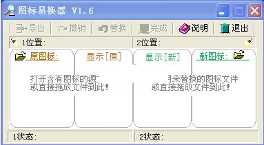 1、将需要被替换或提取的源文件(或快捷方式)直接拖放至“原图标”窗口(或单击程序界面第一个方框中“原图标”文件夹图案,选择并打开将要提取或将要被替换图标的源文件),该文件中的图标将显示在列表中;同样,将提供新图标的源文件(或快捷方式)直接拖放至“新图标”窗口(或单击最后一个方框中“新图标”文件夹图案,选择并打开提供新图标的资源文件),该文件中的图标也显示在列表中;
