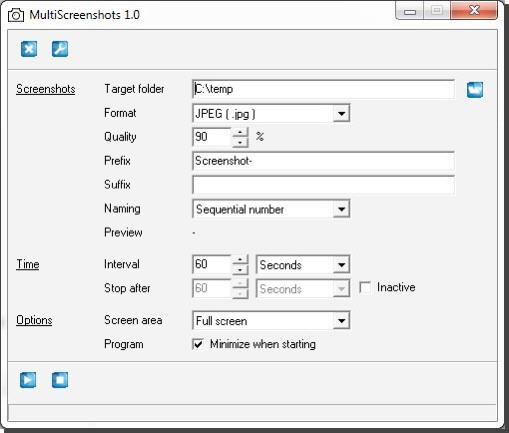 MultiScreenshots 的设置项很简单,首先设置截屏图片保存的地方,然后是图片的格式、质量以及命名方式。接着下面是截图间隔时间以及是否开启自动结束。最下面的 「Screen area」 处默认是全屏截图,但你也可以设置成为 「Screen section」 区域截图。