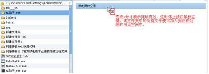 按钮,界面分为左右两块,左侧显示本地文件夹及文件,右侧显示“我的课件空间”,如图2-1。在左侧找到要上传的本地文件,可以按住左键拖入到我的课件空间,或者双击该文件来实现上传。当要上传的视频有很多时,为了操作简便,这时可以将包含这些视频的文件夹用拖动的方法上传。