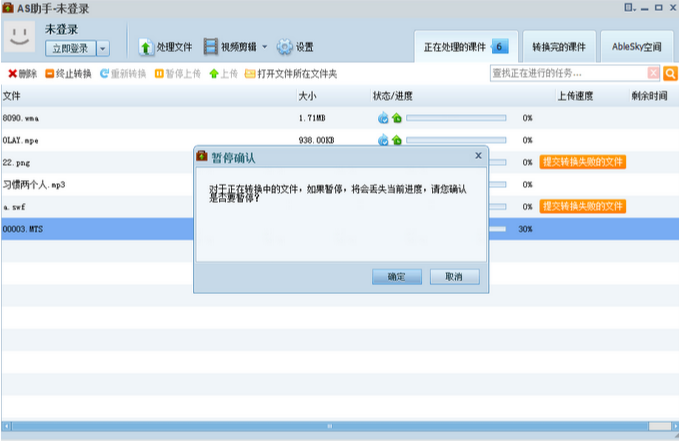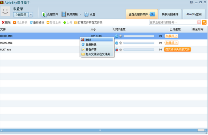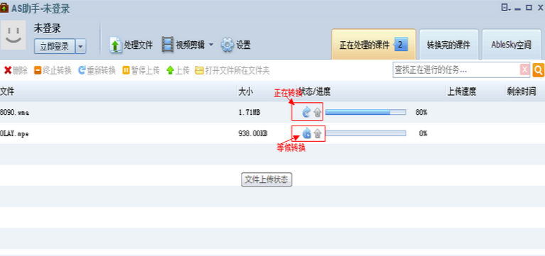 转换后的视频课件后缀为.asc.flv,音频文件后缀为.audioc.flv,PDF文档不用转换直接上传到用户的AbleSky空间中。