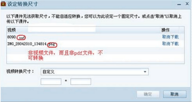 在遇到不能转换的课件时,课件助手会弹出“设定尺寸”对话框,如图2-5。设定尺寸后正在处理的任务中显示转换失败的状态,“取消下载”任务会直接取消。如果用户不希望每次都进行设定,可以在“视频转换设置”中进行设定。具体设置方法,详见8.2视频转换设置。