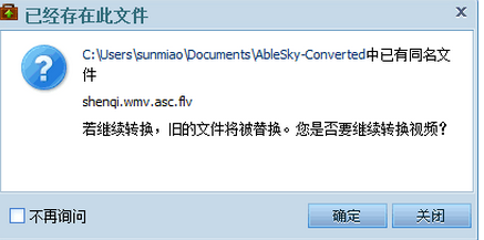 当本地保存转换视频的路径中已经存在正在转换的视频时,会弹出“已经存在此文件” 的对话框,如图2-8,用户可以根据需要选择是否要继续。如果用户想避免每次都要点选的麻烦,可以一次选择后勾选“不再询问”,也可在“视频转换设置”中进行设置。
