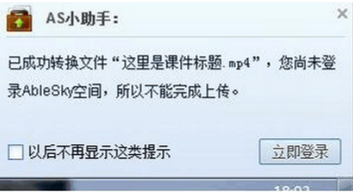 用户若未登录AbleSky空间,课件转换结束后,课件助手会自动在电脑桌面右下角弹出一个课件转换已完成,因未登录不能上传的提示信息框。用户可点击立即登录,登录后课件自动开始上传;用户也可以勾选