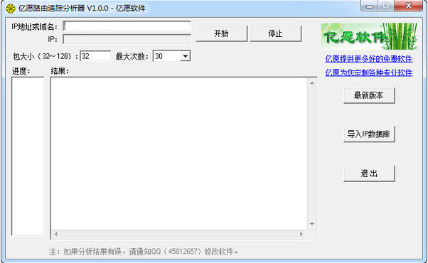 亿愿路由追踪分析器支持路由追踪查询,只需要用户输入IP的地址或者域名,软件就可以帮助用户查询到该IP对应的真实地址了,支持导入IP数据库。