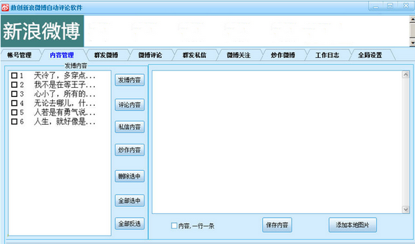 2、可批量上传头像,评论微博,关注微博,群发微博,群发私信等功能!