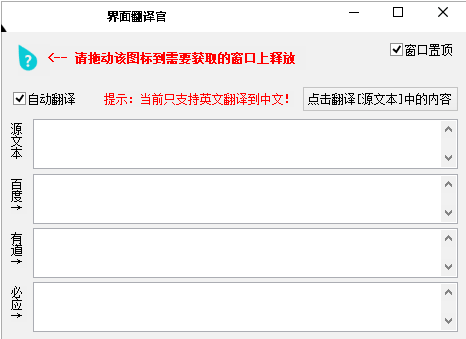 界面翻译官可以帮助用户获取某个软件程序上的源文本,将其翻译成其他文字,支持百度、有道、必应三种翻译工具。注意,目前本工具只支持英文翻译成中文。
