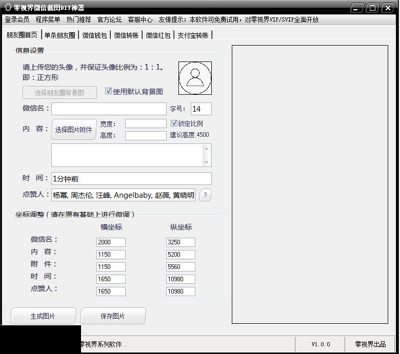 零视界微信截图DIY神器,由零视界技术工作室开发,初衷目的只为达到娱乐作用。本软件可帮助您快速生成各类微信界面截图,普通用户可免费生成预览图(压缩图)不可保存,请合理使用本软件,切勿用于非法用途,否则后果自负。
