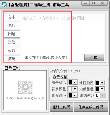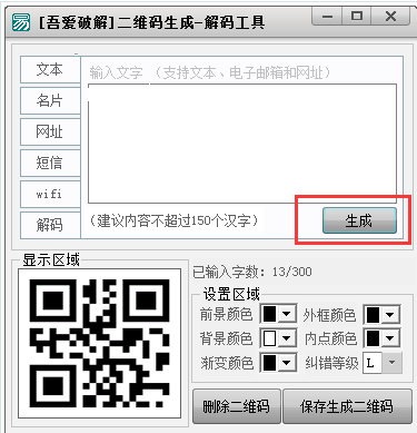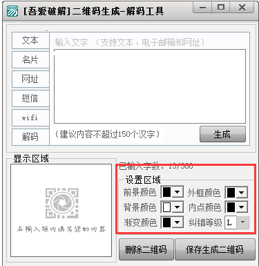 吾爱二维码生成解密工具是一款二维码生成与解码软件,可以帮助用户制作包含多种信息的二维码图片,包括文本、名片、网址、短信、wifi等,支持设置生成二维码图片的颜色和纠错等级,同时还支持二维码解码功能,可以获取任意二维码所包含的信息。