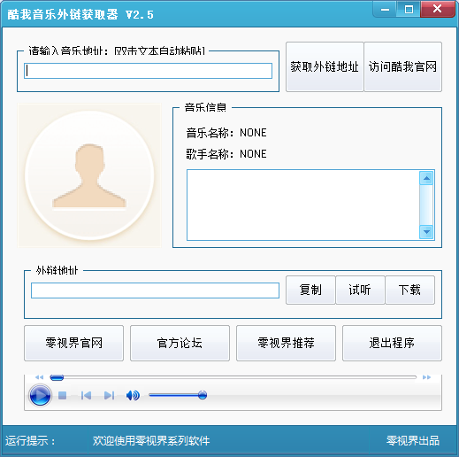 零视界酷我音乐外链获取器(获取酷我音乐库音乐外链地址)可以帮助获取支持酷我音乐库音乐外链地址,支持在线播放下载等贴心功能;支持显示歌曲,歌手,头像,歌词等相关信息。可将音乐免费设置为QQ空间、各大博客背景音乐。