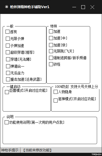 枪林弹雨神枪手辅助是一款为用户提供透视、加速、穿墙、无限跳等一系列给力功能的辅助工具。有需要的可以来此下载。