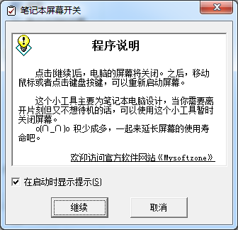 笔记本屏幕开关运行后根据提示就可以用“软件方式关闭电脑屏幕”:之后,移动鼠标或者点击键盘任意按键,就可以重新启动屏幕了。
