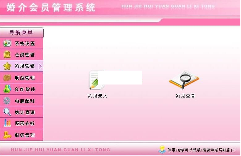 系统设置、会员管理、约见管理、联谊管理、合作伙伴、电脑配对、统计查询、图形分析、财务管理九大部分。