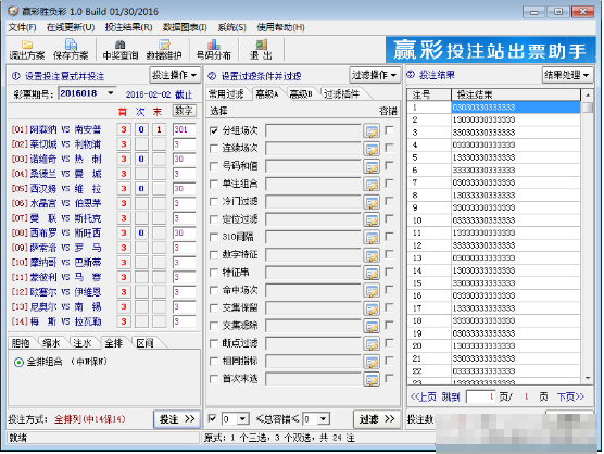 提供常用过滤(310场次、连续场次、积分和以及断点数等)和高级过滤(冷门过滤、赔率过滤、专家媒体、超级媒体过滤、分组过滤、自由过滤、交集差集过滤、特征串过滤、命中分布过滤等)功能,全面支持过滤插件。过滤检验功能可对用户设置的过滤条件进行检验,检查过滤条件设置是否错误,并及时进行总结和修正,大奖尽在掌握。过滤助手功能可根据用户设置的过滤条件对历史开奖数据进行统计,并自动将统计结果返回为过滤条件。