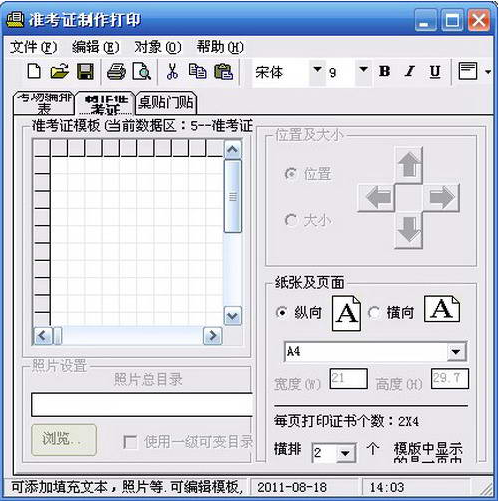 2、准考证(或存根)模板制作简单,灵活。能新建模板,可在任一位置添加固定项目,填充项目,电子照片,普通照片,中缝字号五种对象,能制作出你想要的准考证样式。