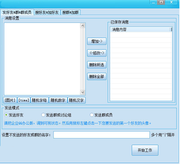 同步企业QQ营销软件,一款多功能的企业QQ营销软件,内置:批量自动登录企业QQ、自动加QQ好友、自动加QQ群、发送临时会话、发送消息等模块,每个模块都可以独立工作互不受影响。软件快速、稳定、升级及时、辅助设置功能强大。